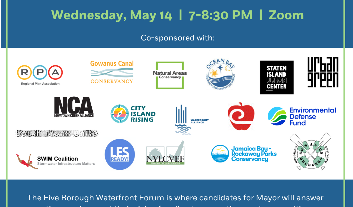 City Island Rising, Environmental Defense Fund, Gowanus Canal Conservancy, Gowanus Dredgers, Jamaica Bay – Rockaway Parks Conservancy, LES Ready!, Natural Areas Conservancy, NYC Soil and Water Conservation District, New York League of Conservation Voters – EF, Newtown Creek Alliance, Ocean Bay CDC, Regional Plan Association, South Bronx Unite, Staten Island Urban Center, SWIM Coalition, Urban Green Council, and the Waterfront Alliance.