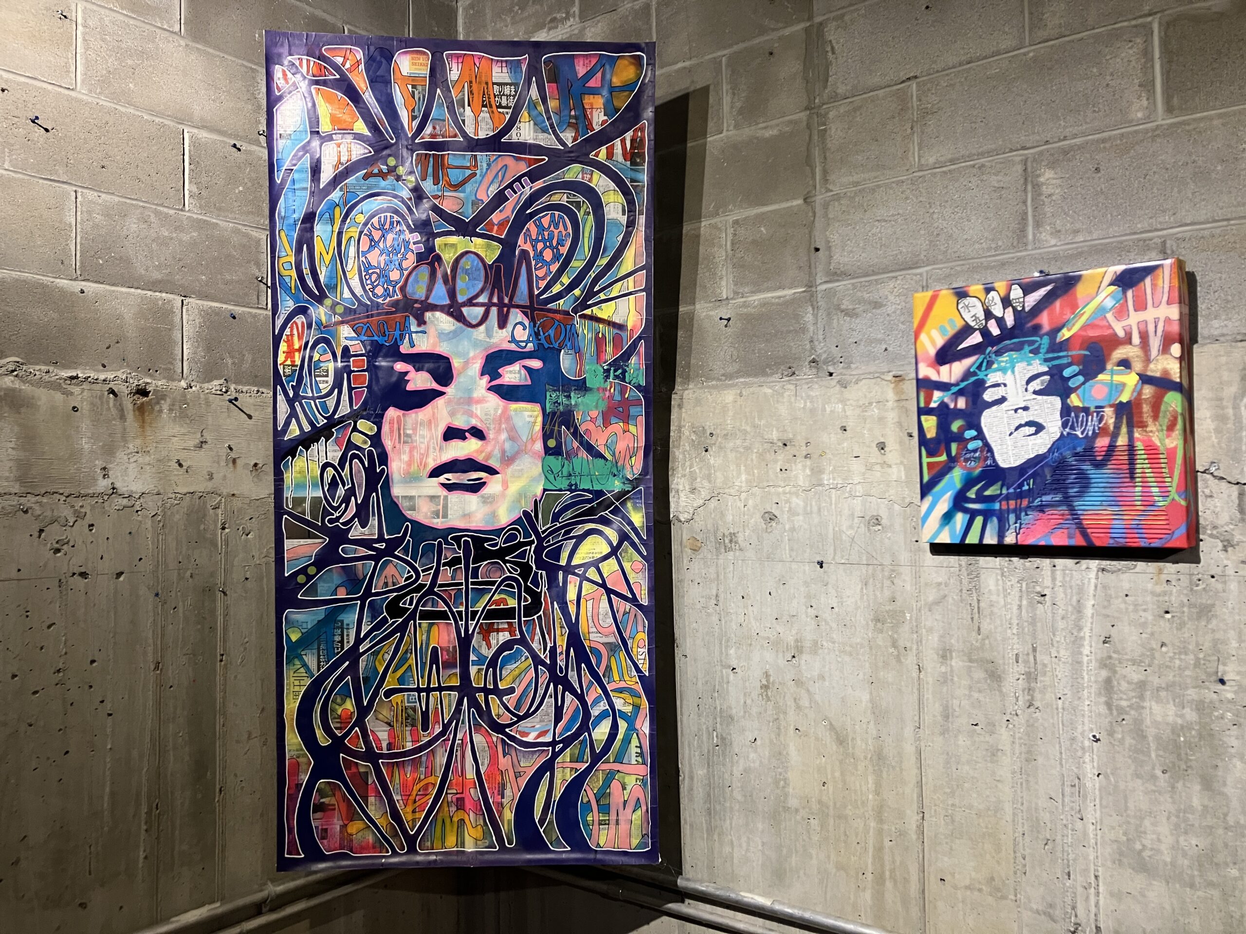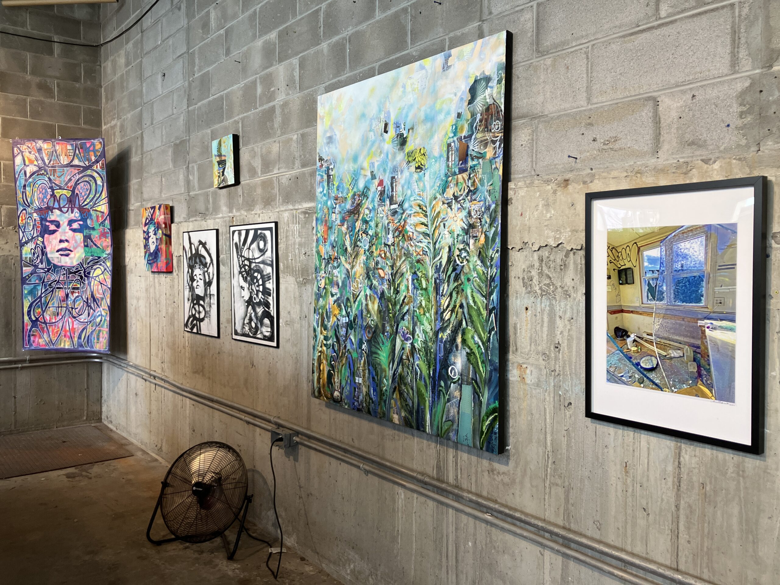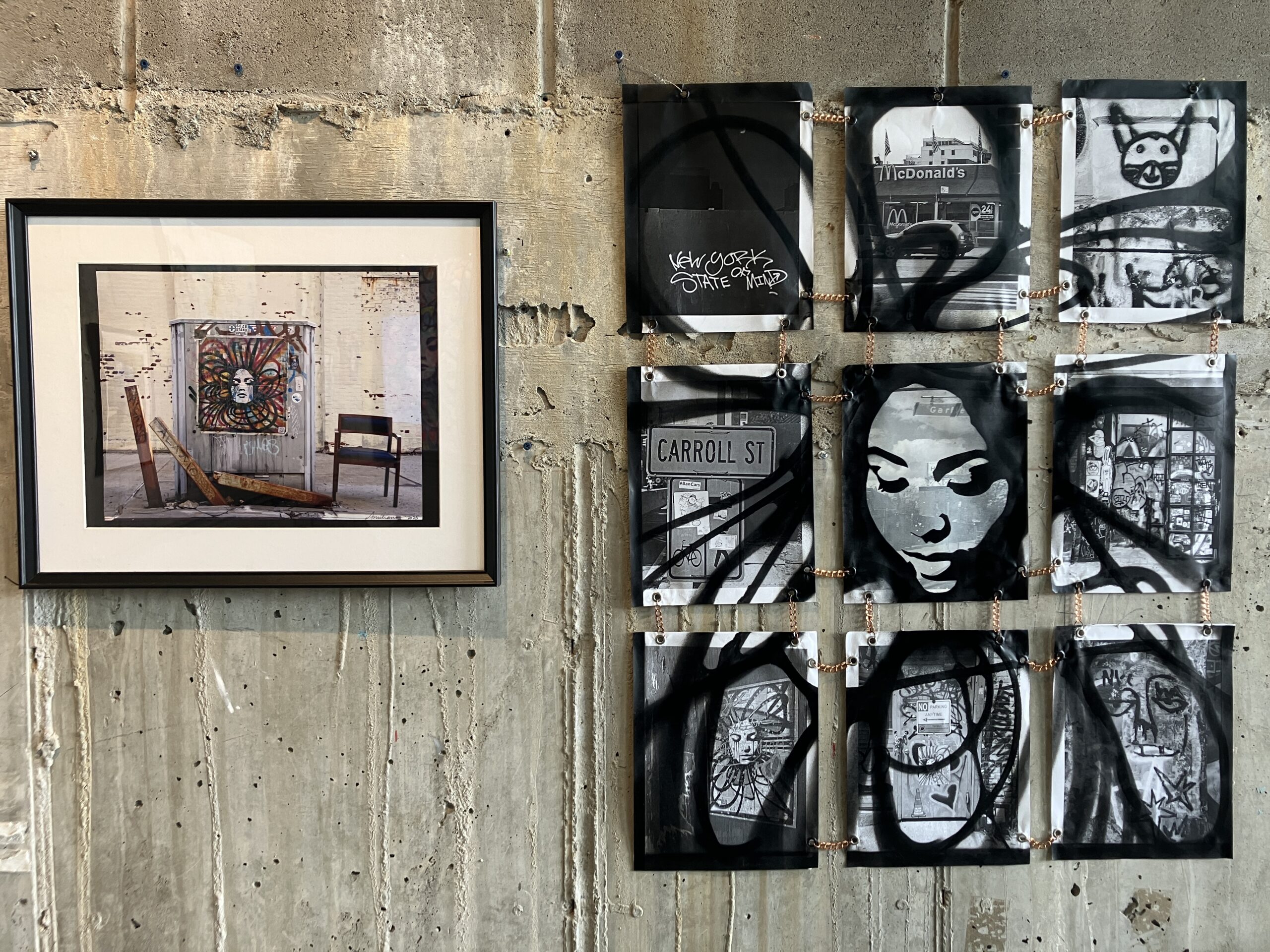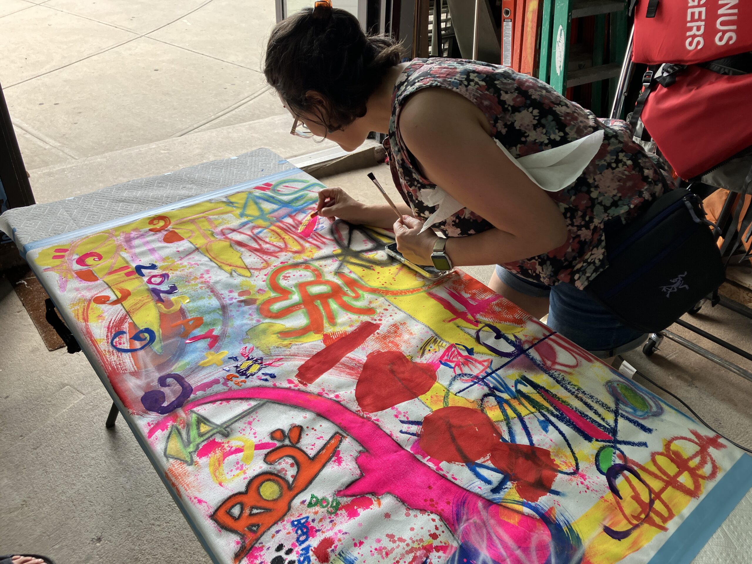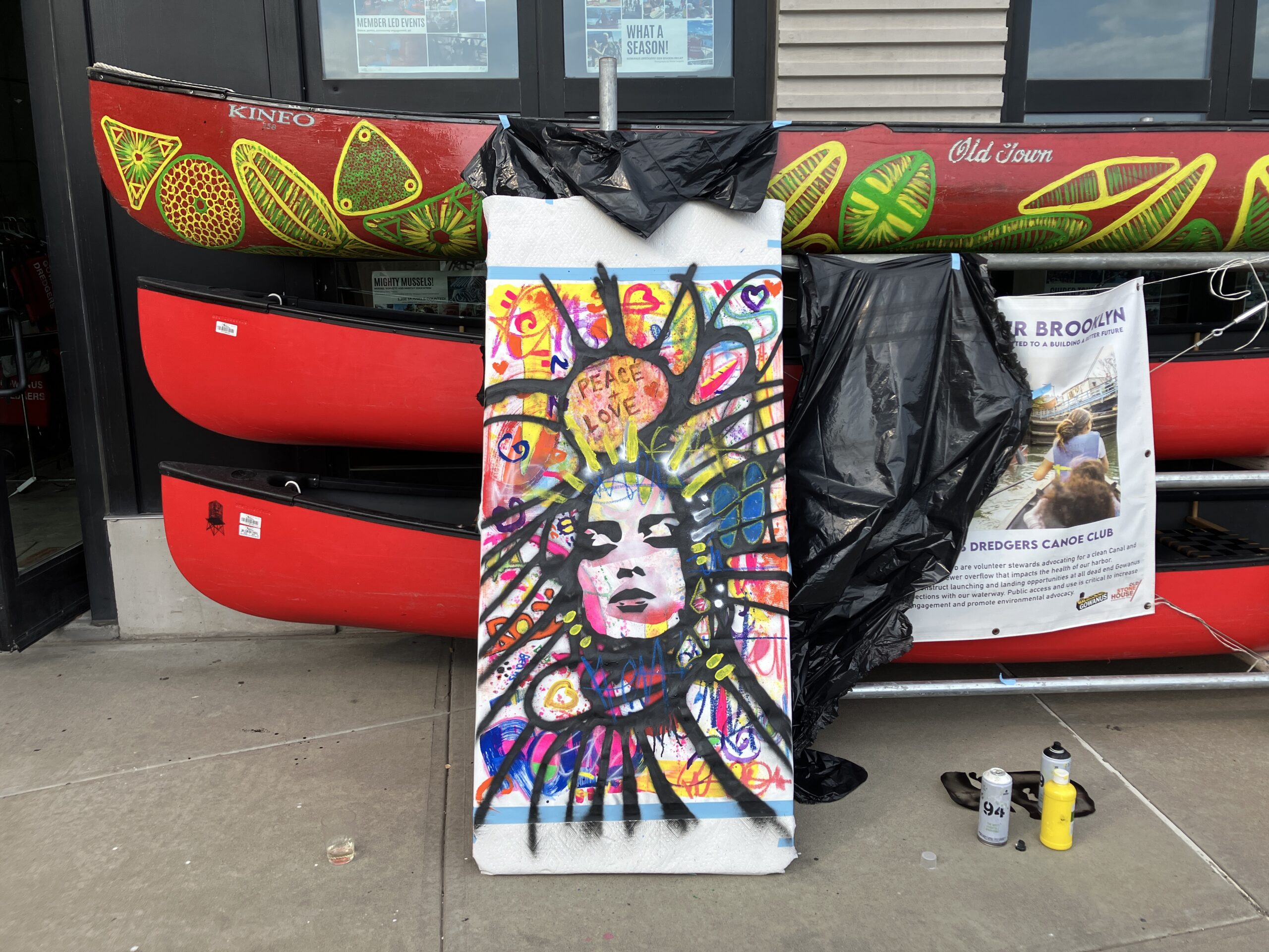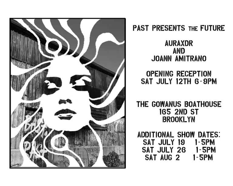 Throughout the duration of the exhibition, the artists hosted a raffle, offering a chance to win an original artwork by AURAxDR. With a minimum $5 donation, visitors had the chance to add their own creative touch to a collaborative canvas. (Art supplies were provided.) On the last day of the exhibit, AURAxDR added his signature “AURA” image to the completed piece. Lucky raffle entrant, KB, got to take home this unique work of art! All proceeds were donated to the Gowanus Dredgers and their amazing community programming. Thank you Joann and AURAxDR!